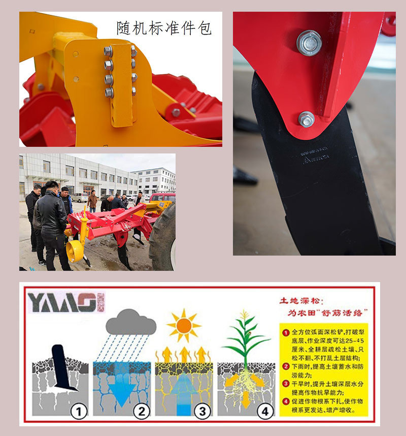 4、使用效益高; 采用原裝進(jìn)口硼鋼深松鏟,具有高強(qiáng)度和超耐磨性,比傳統(tǒng)部件使用壽命提高3-4倍,并利用保險(xiǎn)螺栓進(jìn)行過(guò)載保護(hù)。使用壽命長(zhǎng)