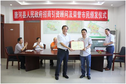 9月1日,唐河縣人民政府舉行招商引資顧問及榮譽市民頒發(fā)儀式。縣長周天龍、政府副縣長王天清、縣產(chǎn)業(yè)集聚區(qū)黨工委書記王全廣等出席儀式。